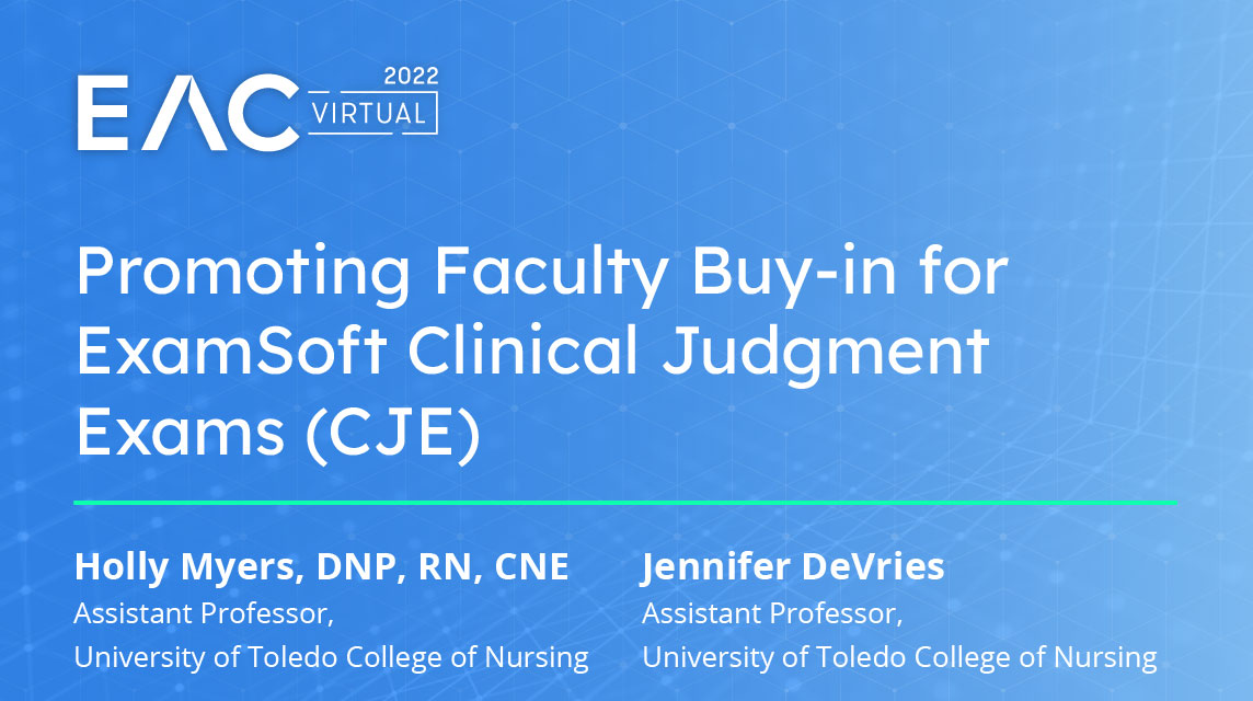Clinical Judgment Exams (CJE) created by NurseThink® and administered through ExamSoft is an effective way to improve student readiness and success for passing the NGN. This presentation details a nursing faculty member’s experience with development and implementation strategies to encourage and support college-wide use of CJE’s and ExamSoft products.